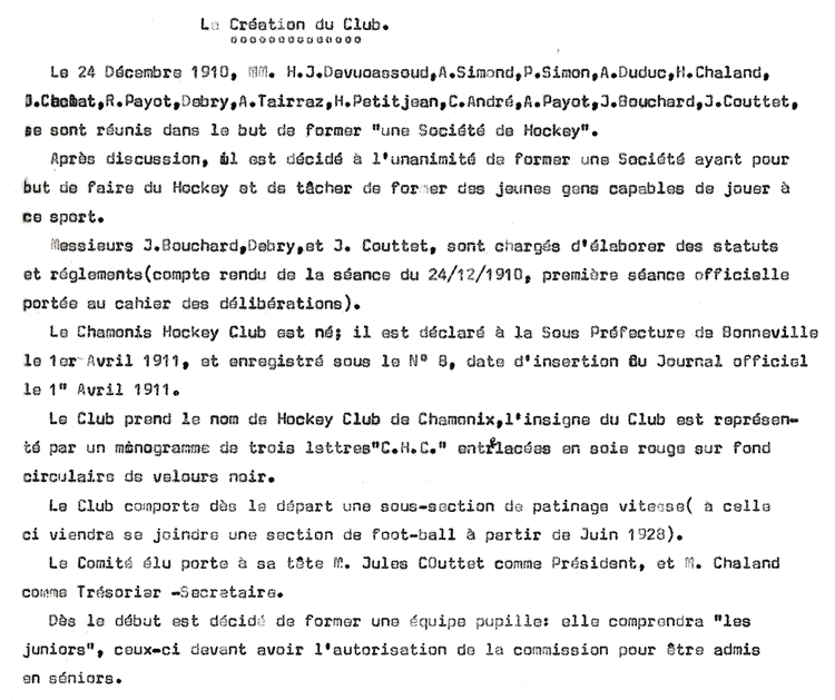 Lors de la saison 2009/2010, le Chamonix Hockey Club a fêté ses 100 ans. Très peu de clubs en France ne peuvent s’enorgueillir d’une telle longévité et d’un tel palmarès.